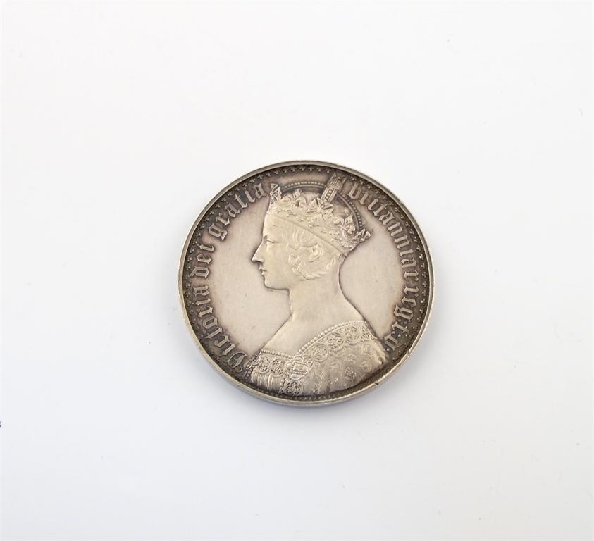 Victoria, silver proof Gothic Crown, 1847, with plain edge, crowned bust left, rev four crowned shields cruciform, emblems in angles (ESC 291; S.3883). Extremely fine, slight peripheral toning.