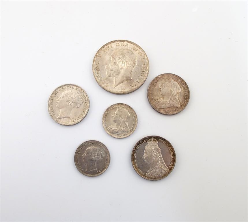 (S 3907, 3912); Jubilee coinage, Shilling, 1889, large head (S 3927); old head coinage, Shilling, 1893 and sixpence, 1901 (S 3940, 3941); George V, Halfcrown, 1916 (S 4011). Extremely fine or nearly so. (6).