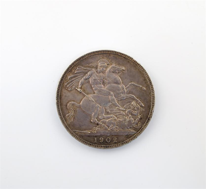 Edward VII, Coronation 1902, silver Crown, bare head right, rev St. George (S 3978). Good very fine.