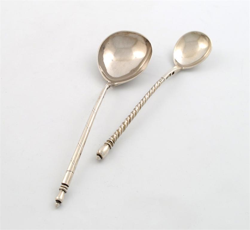 A late 19th century Russian silver spoon, the reverse of the bowl with engraved foliate decoration, tapering stem, plus another Russian silver spoon, 1880, twisted stem, lengths 17.8 and 16.2cm, approx. weight 2.4oz. (2)