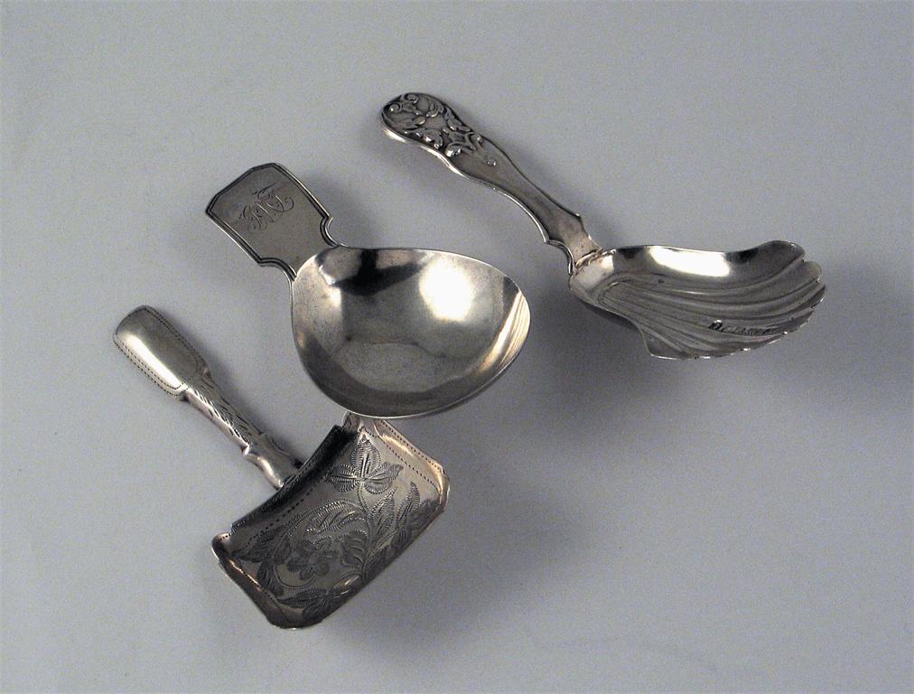 A George III caddy spoon, by S Godbehere, E Wigan and I Bult, London, 1802; a Victorian spoon with a fan shaped bowl and a William IV example with an engraved oblong bowl and a fiddle pattern stem, (3).