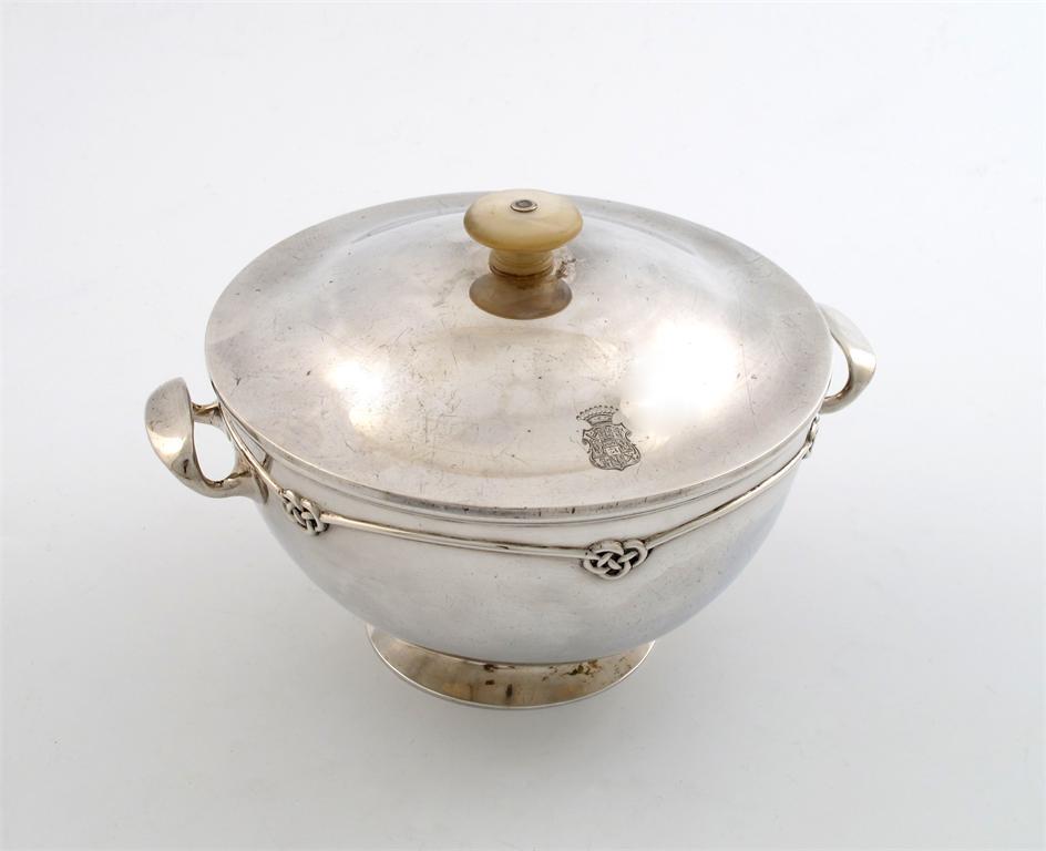 circular tapering form, with an intertwined girdle and plain side handles, domed pull-off cover with a mother-of-pearl finial, gilded interior, engraved with two armorials, on a raised circular foot, diameter 14.5cm, approx. weight 16oz.