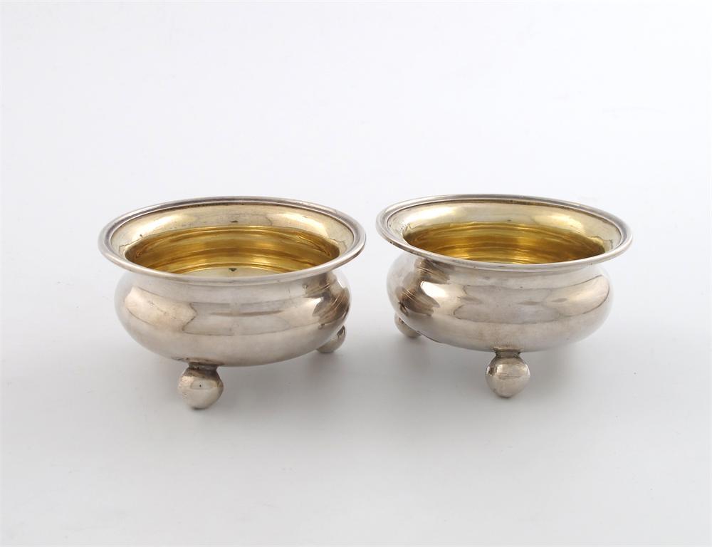 circular form, the interior of the bowls gilded, on three ball feet, diameter 7.1cm, approx. weight 3.2oz. (2)