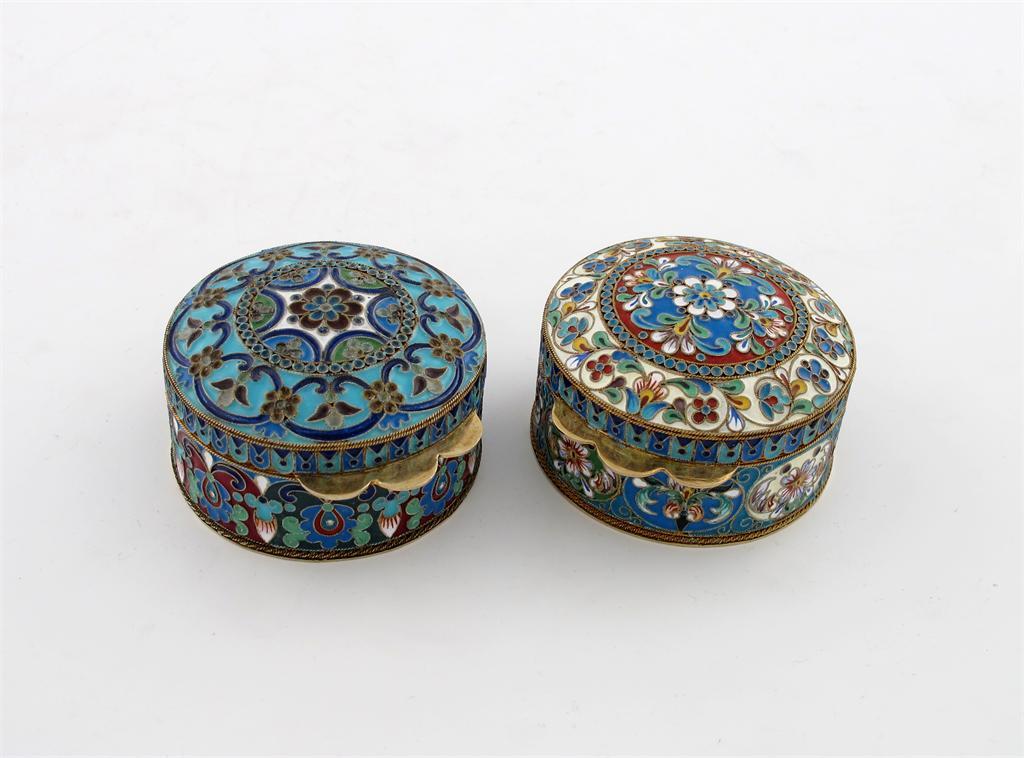 circular form, the hinged cover with plique-a-jour enamel decoration and the body with polychrome foliate enamel decoration, plus another Russian silver-gilt box, 2oth century, circular form, with similar decoration, diameter 6.3cm. (2)
