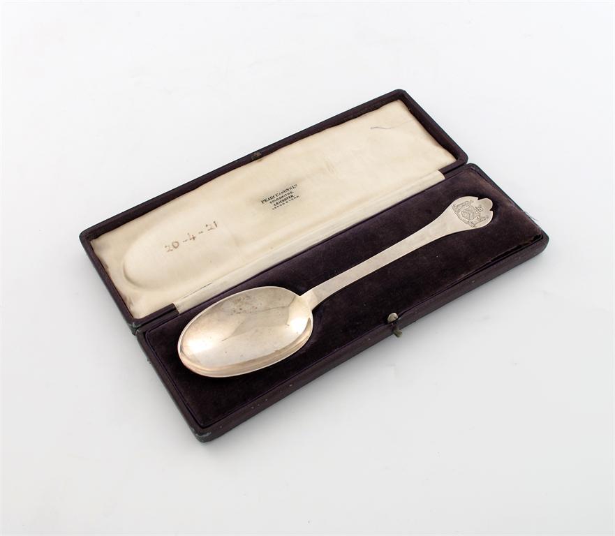 the reverse of the bowl with a beaded rat-tail, the terminal engraved with the arms of the Company, length 20.5cm, approx. weight 2oz. In a fitted case.