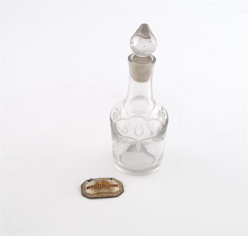 mallet form, faceted stopper, with an engraved sauce label, titled 'SOY', height 12cm.
