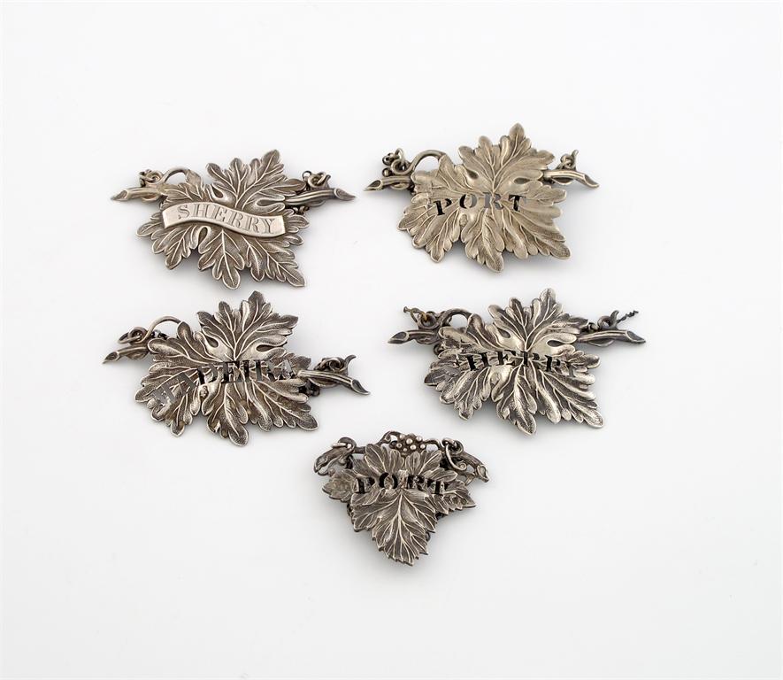 pierced 'MADEIRA', plus a Victorian vine leaf label, incised 'SHERRY', Birmingham 1842, plus a Victorian vine leaf label, 'PORT', by Henry Holland, London 1872, plus two electroplated vine leaf wine labels. (5)