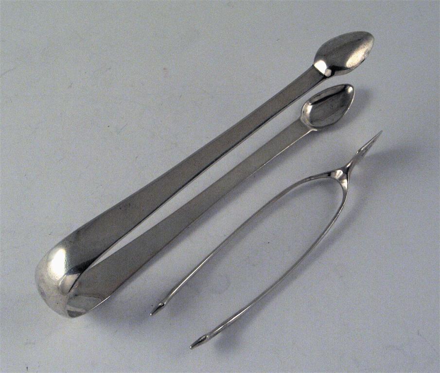 A pair of modern Scottish provincial 'wishbone' sugar tongs, by William Robb of Ballater (WR, BLTR), with Edinburgh hallmarks for 1925, together with a pair of George III sugar tongs, (2).