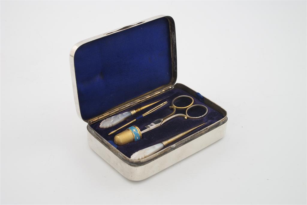 A Victorian silver box, by William Summers, London 1864, rectangular form, the hinged cover initialled, converted for sewing implements, the interior with a gold and enamel thimble, a pair of scissors a bodkin and two other items, length 12cm.