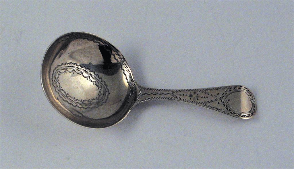 A George III bright - cut caddy spoon, with a circular bowl, and a vacant cartouch, probably by Thomas Barker, London, 1801.