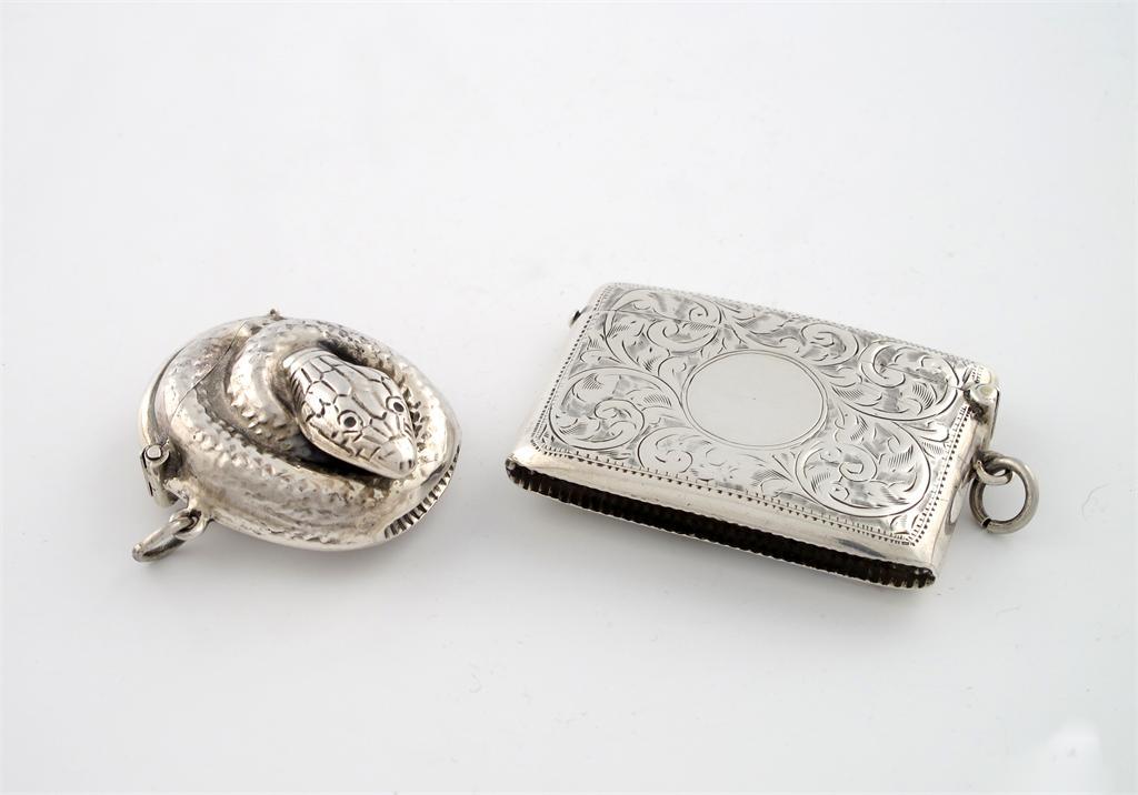 A silver vesta case, by J. Gloster Ltd, Birmingham 1923, rectangular form, engraved foliate scroll decoration, the interior with two compartments, plus a modern metalware vesta case, modelled as a coiled snake. (2)