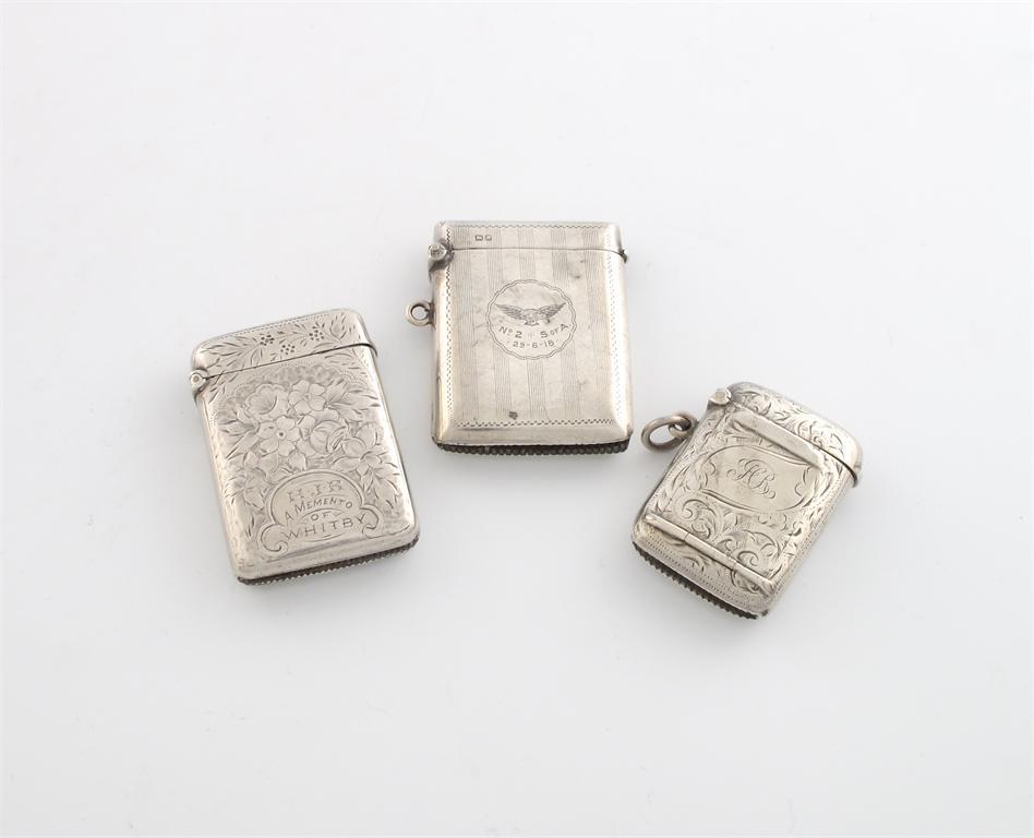 comprising one with a combination stamp case, Birmingham 1904, rectangular form, engraved foliate decoration, plus two other vesta cases, inscribed ' A Memento of Whitby' and one engraved with an eagle above 'No. S of A, 29-06-18', approx. total weight 2.6oz. (3)