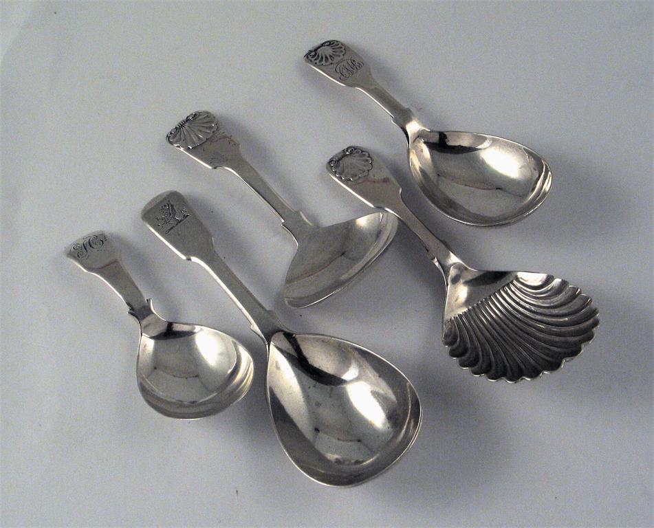 Five assorted fiddle pattern caddy spoons