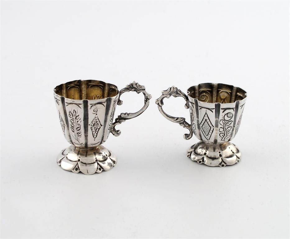 A pair of continental silver liqueur cups, probably 19th century, lobed tapering circular form, embossed decoration, scroll handles, on a lobed circular foot. (2)