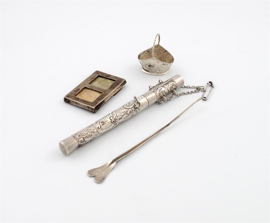 comprising: an Edwardian silver thermometer case, Birmingham 1909, a miniature basket with import marks for London 1901, a medical instrument stamped 'Mayer and Meltzer, and the top of a stamp box, approx. weighable 1.5oz. (4)
