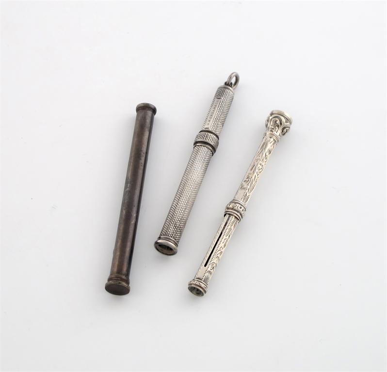 A 19th century silver propelling pencil, maker's mark worn, circa 1830, plain cylindrical form, plus a Victorian engine-turned silver propelling pencil, by S. Mordan, and another pencil. (3)
