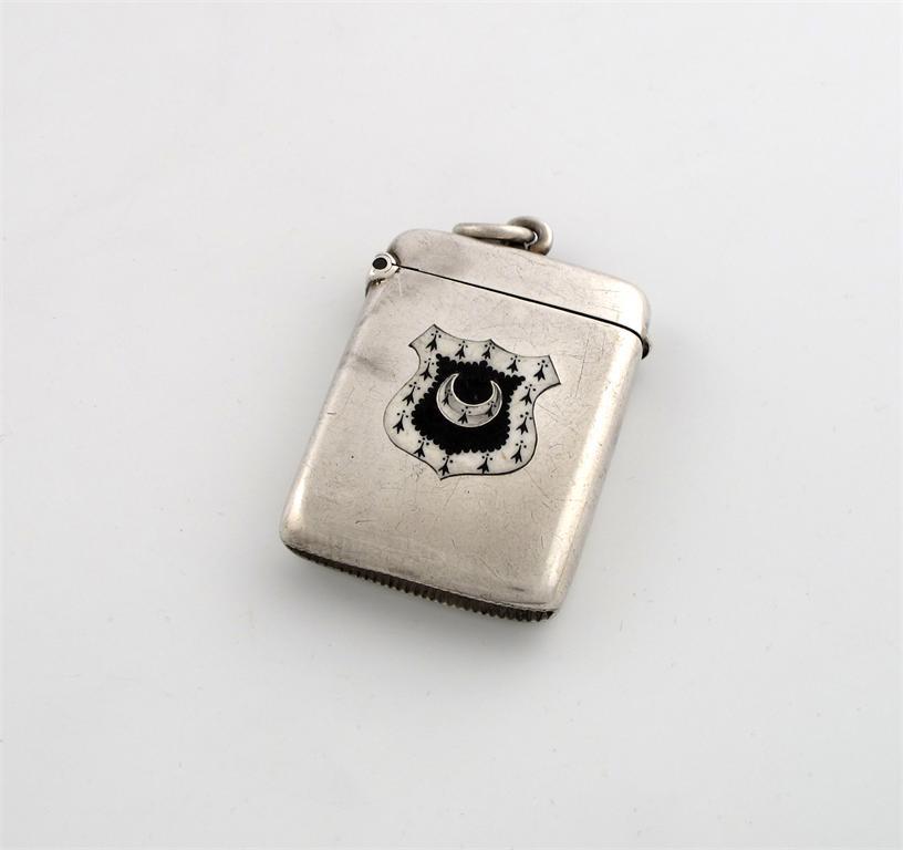 An Edwardian silver and enamel vesta case, by T. Hayes, Birmingham 1901, rectangular form, enamelled with the arms of Trinity Hall College, Cambridge, length 4.8cm, approx. weight 0.9oz.