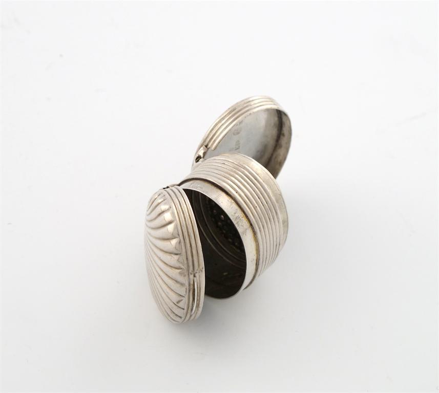 A George III silver nutmeg grater, by Matthew Linwood, Birmingham 1803, oval form, fluted hinged cover, plain hinged base, length 3.3cm.
