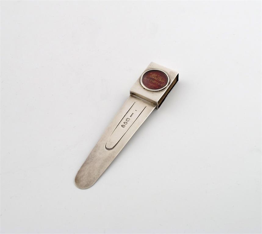 A late-Victorian silver page marker, by S.Mordan and Co, London 1895, tapering form, the rectangular finial with a magnifying glass and miniature dictionary, length 10.2cm.