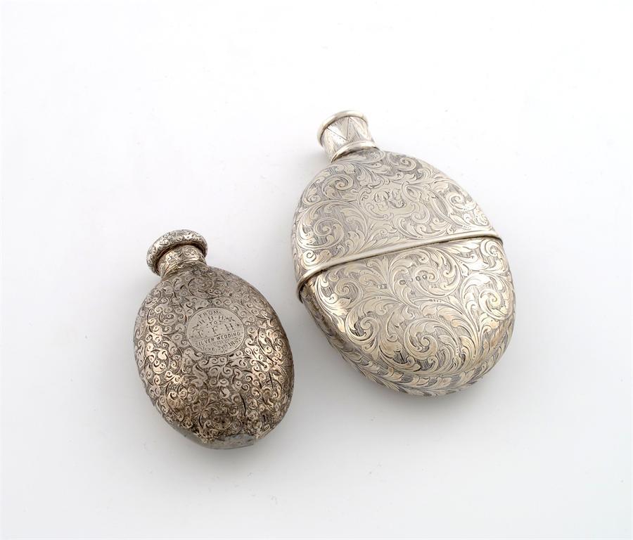 oval form, engraved foliate scroll decoration, pull-off drinking cup, plus a Victorian silver hip flask of oval form, engraved foliate decoration, London 1886, both inscribed, approx. weight 6oz. (2)