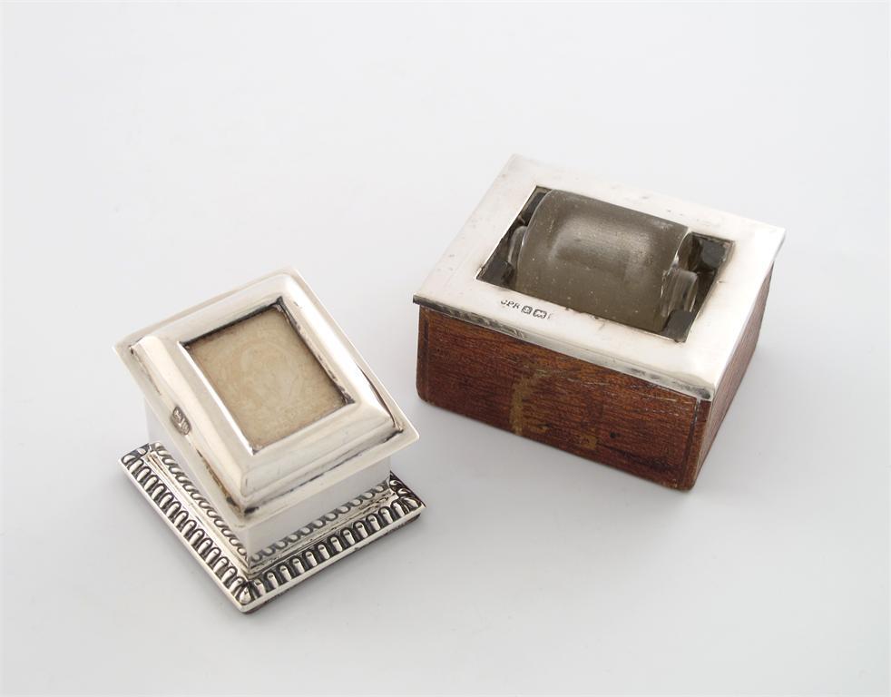 An Edwardian silver stamp box, maker's mark worn, Chester 1901, rectangular form, hinged cover set with a faded stamp, the base with a gadroon border, plus an Edwardian silver stamp roller, Birmingham 1906. (2)
