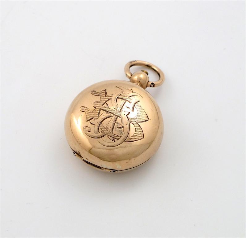 A late-Victorian 9 carat gold sovereign case, by M & L, Birmingham 1898, circular form, engraved with a monogram, approx. weight 12.5g.