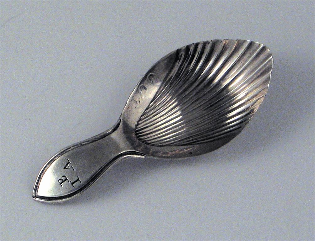 A George III provincial caddy spoon, with a stamped fluted bowl, and a navette shaped stem, initialled 'B' over 'I A', by Nathaniel Smith and Co., Sheffield, 1794.