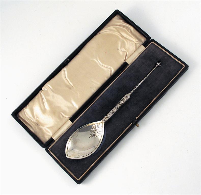 A cased modern Iona spoon, sponsors mark ICA, Birmingham hallmarks for 1935 and incuse mark A.R. Iona (for Alexander Ritchie), 7.9in (20cm), 1.5oz.