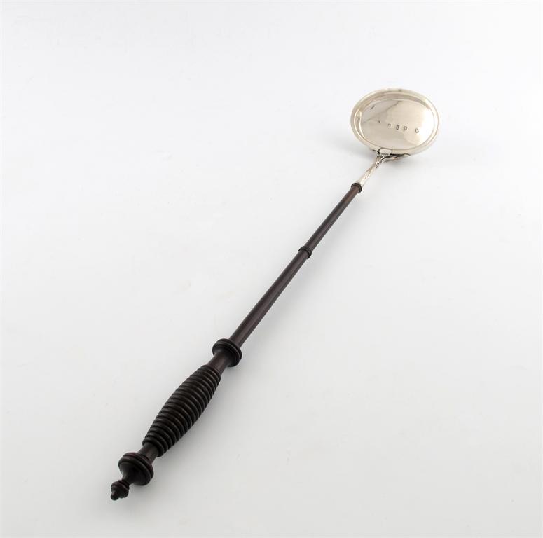 A William IV Scottish silver toddy ladle, by George Innes, Edinburgh 1831, oval bowl with a bifurcated scroll support, turned wooden baluster handle, length 44.8cm.