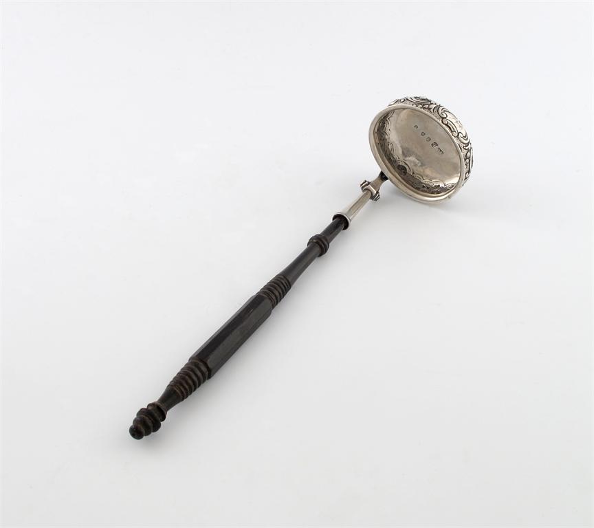 A George IV silver toddy lalde, maker's mark partially worn, Edinburgh 1822, oval bowl with embossed foliate decoration, turned wooden baluster handle, length 29.5cm.