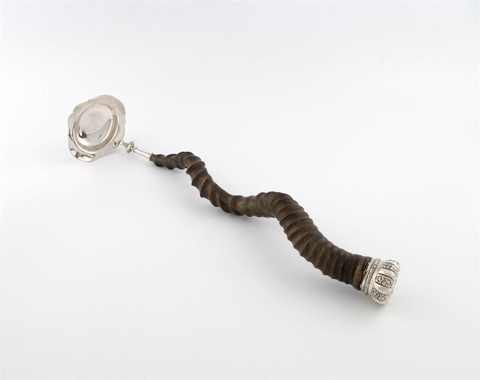 A Scottish provincial silver toddy ladle, the bowl marked for R and R Keay, Perth circa 1825, oval bowl with a scroll mount, the horn handle with an unmarked and possibly unassociated foliate terminal, length 37.5cm.
