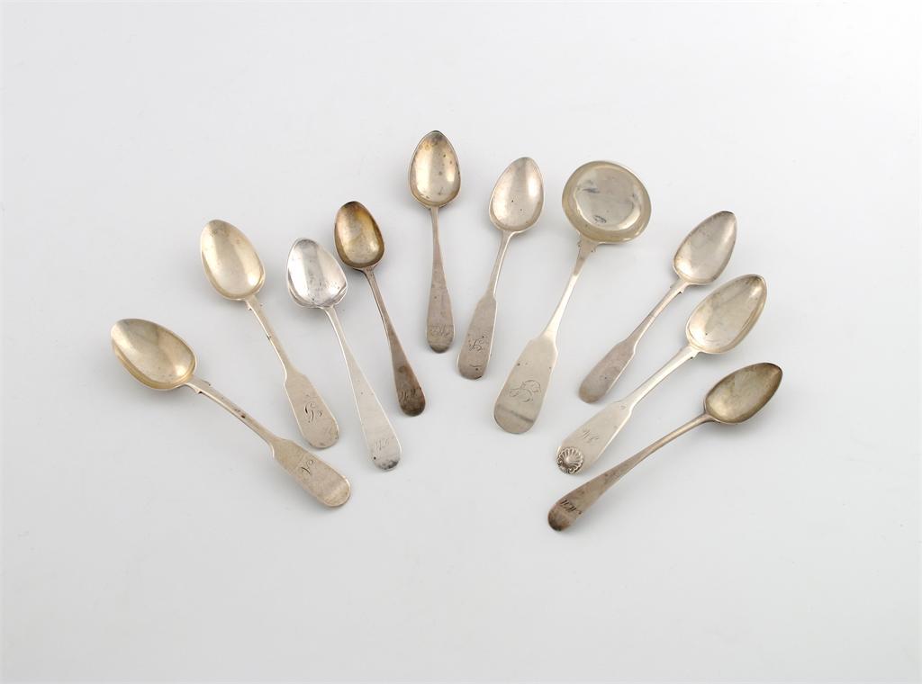 comprising: a George IV Fiddle pattern toddy ladle, by P Sutherland, Edinburgh 1829, the terminal with a script initial, plus two Aberdeen teaspoons and seven other teaspoons, approx. weight 4oz. (10)