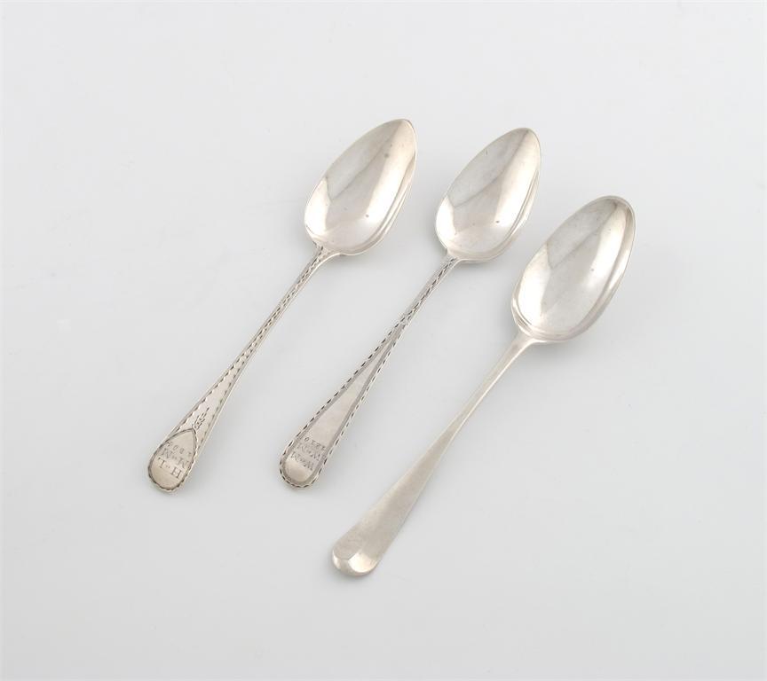 the reverse of the terminal with a monogram, plus two George III Bright-cut tablespoons, by Joseph Hicks, Exeter 1804 and 1810, the terminals scratch initialled 'H*L' over 'M*M' '1804', and 'W*M' over' W*M' '1810', approx. weight 4.5oz. (3)