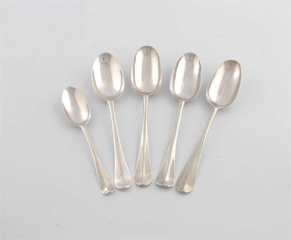 all with plain rat-tails, the reverse of the terminals crested and scratch initialled, approx. weight 8oz. (5)