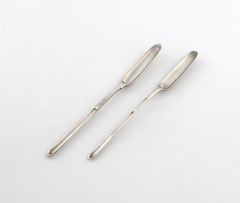 A George III silver marrow scoop, by Richard Crossley, London 1795, plain form, with shoulders, and engraved with a crest, length 23cm, plus a George III silver marrow scoop, by Richard Crossley, London 1786, length 22.7cm, approx. weight 3.3oz. (2)
