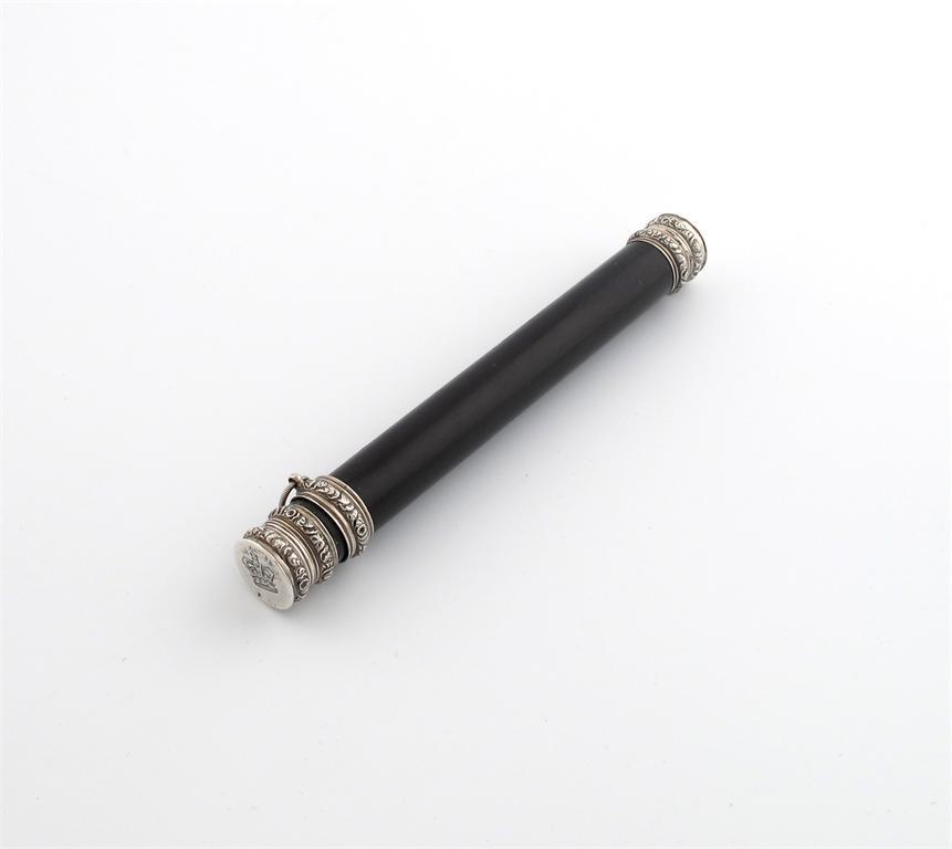cylindrical form, the terminals with foliate mounts and engraved with a crown and inscribed 'W.J.M' 'EDINB', the centre with a sliding foliate ring, length 14.9cm.