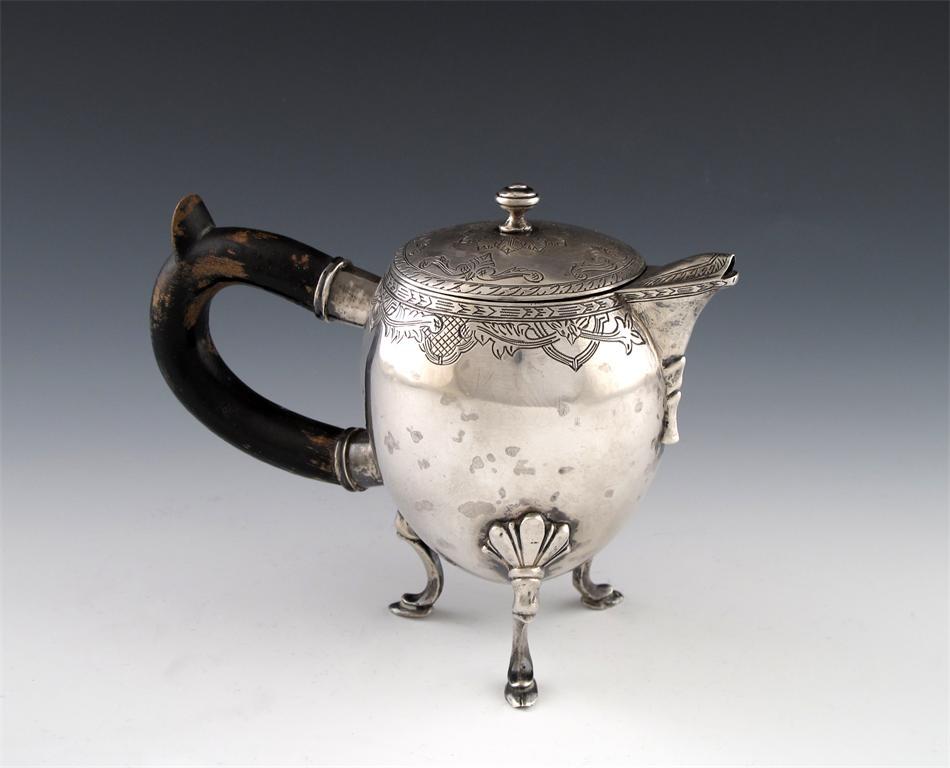 A continental hot milk jug, unmarked, ovoid form, elongated scroll handle, engraved foliate decoration, flush hinged cover, on four scroll hoof feet, height 15cm.