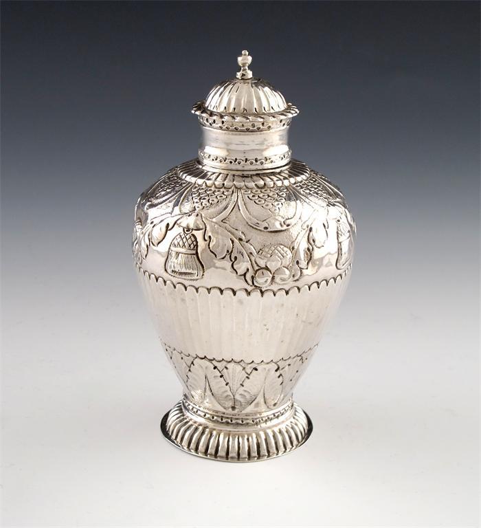 A 19th century Dutch silver tea canister, bearing pseudo earlier Amsterdam marks, tapering circular form, part fluted and embossed foliate decoration, pull-off fluted cover, on a raised fluted circular foot, height 14.5cm, approx. weight 4oz.