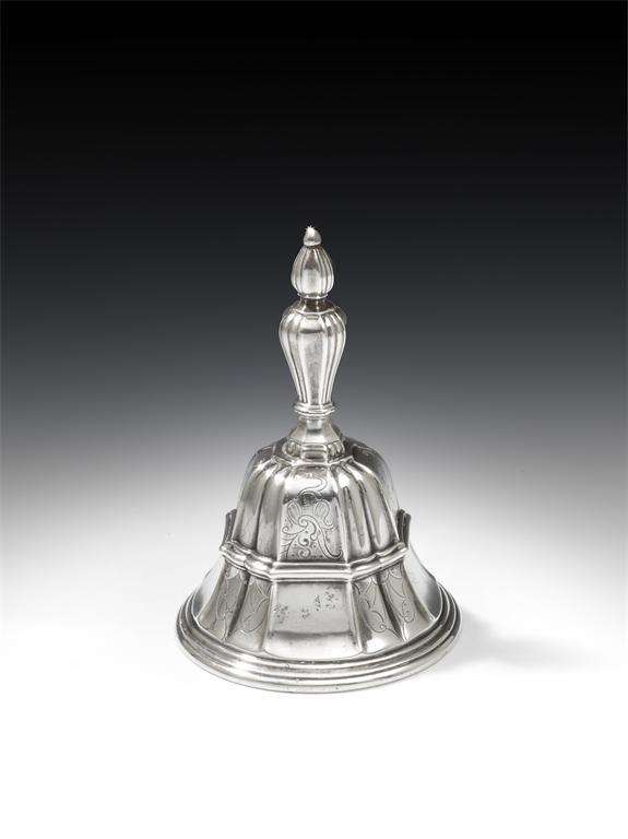 A 18th century Dutch silver table bell, by Jan Diederik Pont, Amsterdam, date letter C, for 1737 or 1762, tapering faceted octagonal and circular form, octagonal baluster handle, chased foliate decoration, height 13cm, approx. weight 10oz.