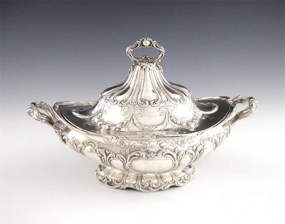 An American silver two-handled tureen and cover, by Gorham and Co, lobed oval form, scroll side handles, domed pull-off cover with fluted and ribbon-tied garlands of swags, on a shaped oval foot, length handle to handle 30cm, approx. weight 36oz.