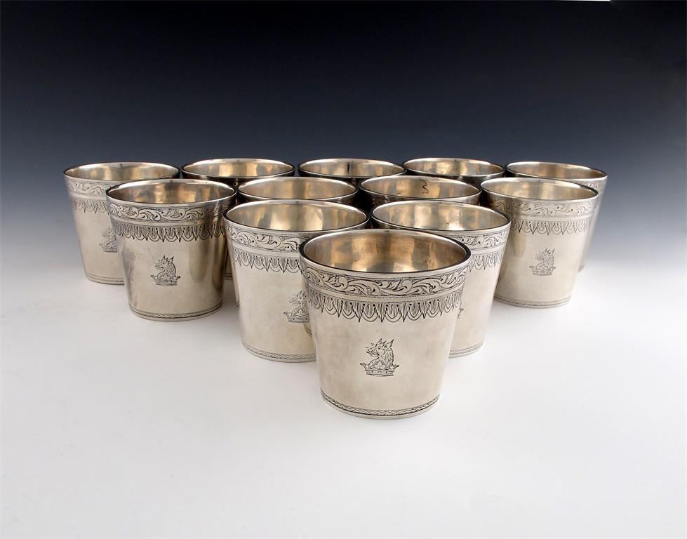A set of twelve silver beakers, with cancelled marks and London Assay Office marks for 2011, tapering circular form, engraved borders and engraved with a crest, height 7.8cm, approx. weight 68oz. (12)