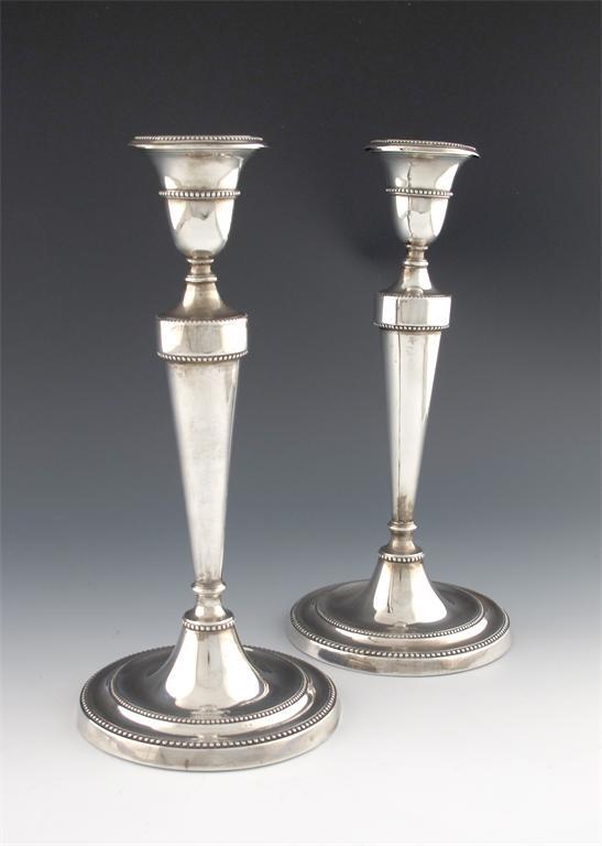 A pair of George III silver candlesticks, by John Younge and Co, Sheffield 1784, tapering circular form, beaded borders, urn shaped capitals, on raised circular bases, height 25.3cm. (2)