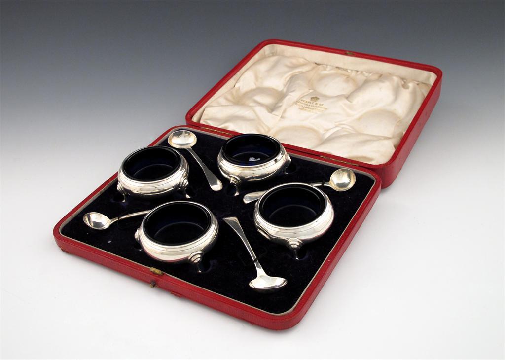 A set of four George II silver salt cellars, by John Muns, London 1757, circular cauldron form, rope work borders, on three hoof feet, with blue glass liners and with four later salt spoons, in a later fitted case, approx. weight 6oz.
