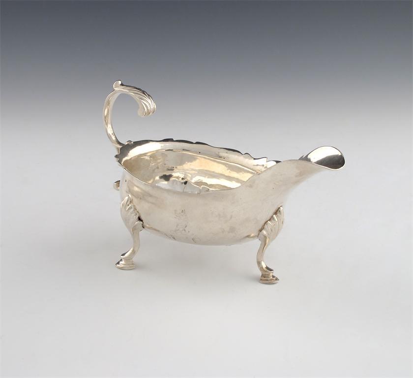 A George III silver sauce boat, by Nathaniel Appleton and Anne Smith, London 1773, oval form, leaf capped scroll handle, wavy edge border, on three shell caped hoof feet, engraved with a crest and scratch initial, length 15.5cm, approx. weight 4oz.