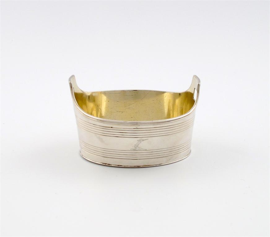 oval tub form, with an upper and lower reeded border, inset handles, gilded interior, engraved with a crest, length 8.2cm, approx. weight 3oz.