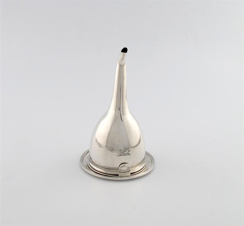 A George III Irish silver wine funnel and stand, by James Le Bas, Dublin 1816, circular form, reeded border, plain clip, engraved with a crest, the stand of raised circular form, height 15.3cm, diameter 9.7cm, approx. weight 5.3oz. (2)