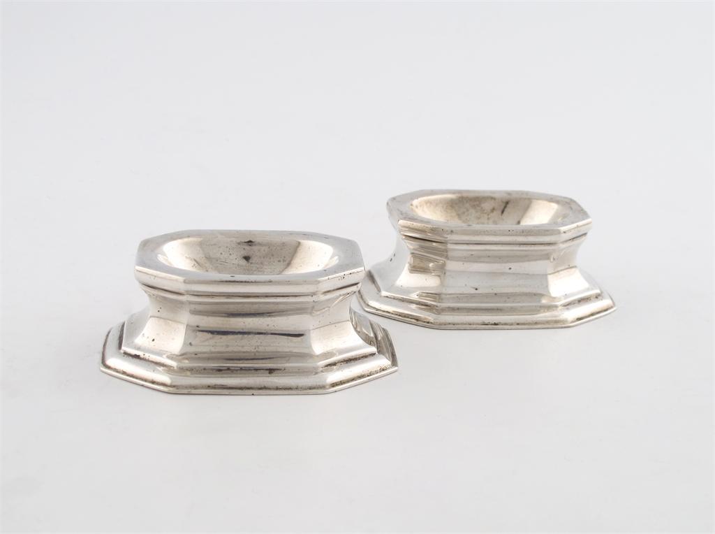 A pair of silver trencher salt cellars, by T. Bradbury and Son, Sheffield 1936, rectangular form, canted corners, length 7.9cm, approx. weight 4oz. (2)