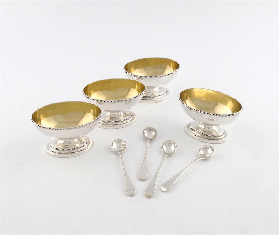 oval form, beaded borders, on a raised beaded oval foot, gilded interior, length 9cm, plus a later set of four silver salt spoons, London 1815, approx. weight 10oz. (8)