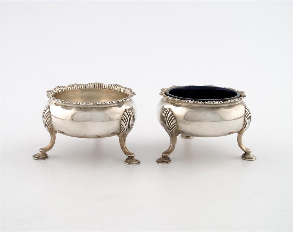 A pair of George III silver salt cellars, by James Waters, London 1771, circular form, gadroon border, on four hoof feet, with one blue glass liner, diameter 7cm, approx. weight 5.5oz. (2)