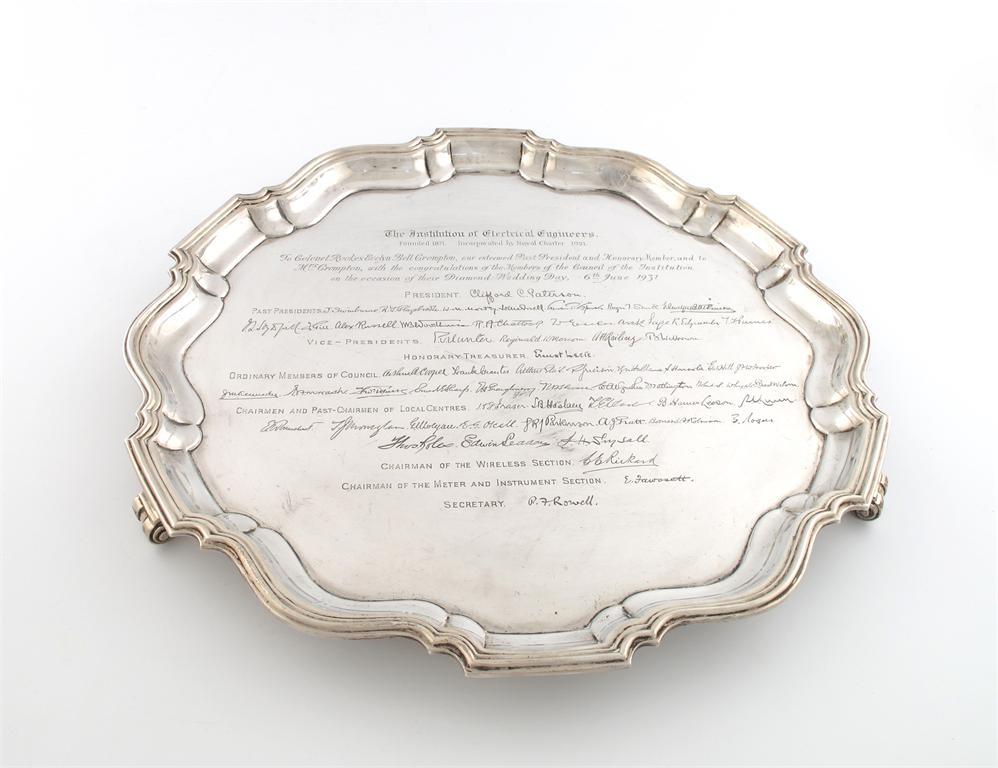 circular form, on three scroll feet, inscribed with a presentation inscription and facsimile signatures, diameter 41cm, approx. weight 65oz.